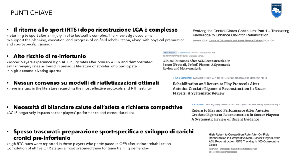 Questo PowerPoint nasce a margine del mio intervento al convegno dal titolo, "LCA: DAL TRAUMA AL RITORNO AL CAMPO" tenutosi a Pescara il 10 Settembre 2025, con l’obiettivo di ripercorrere le tappe fondamentali di tale processo, evidenziando i punti chiave che permettono di trasformare un momento di stop forzato in un’opportunità di crescita e di ritorno in sicurezza alla performance calcistica.