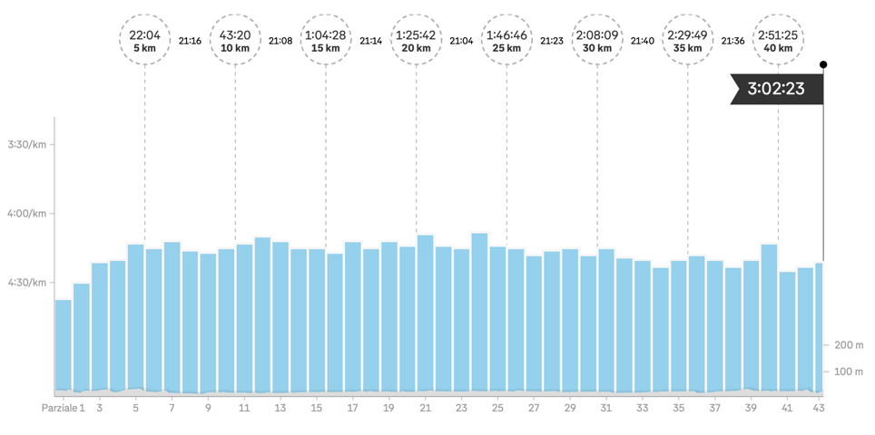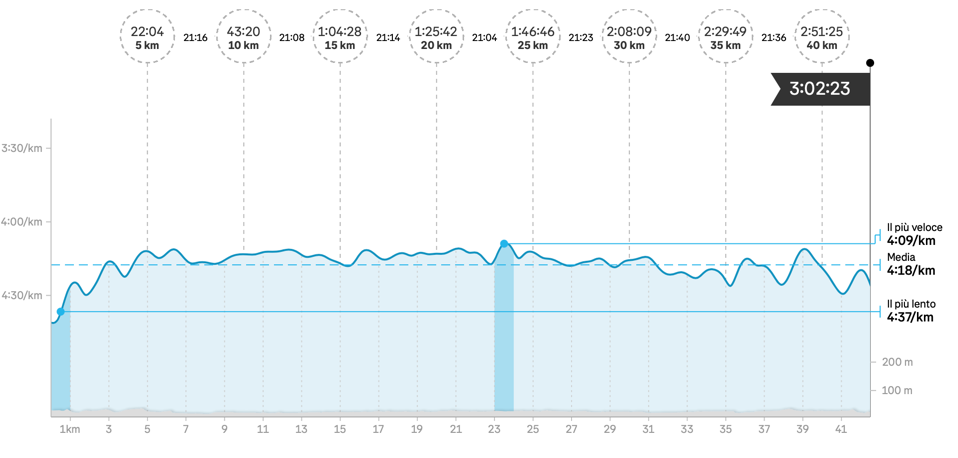 La fatica comincia a sentirsi al km 38, percepivo le gambe non essere più brillanti e giro tra i 4:23/km e i 4:25/km. A questo punto ho lavorato più con la testa, cercando di “sedare” la fatica con pensieri positivi che in qualche modo avrebbero fatto trascorrere il tempo più velocemente, così è stato.