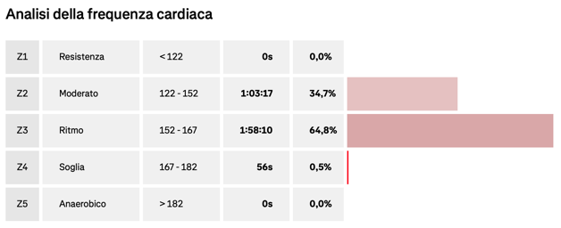 Il carico cardiaco è stato in prevalenza sulla Zona 3 (rispecchia il ritmo più veloce che ho impostato), solo inizialmente la Zona 2 con la soglia in Zona 4 toccata negli ultimi km di gara (prevedibile una deriva nel finale, contenuta quindi il rischio è risultato “calcolato”)