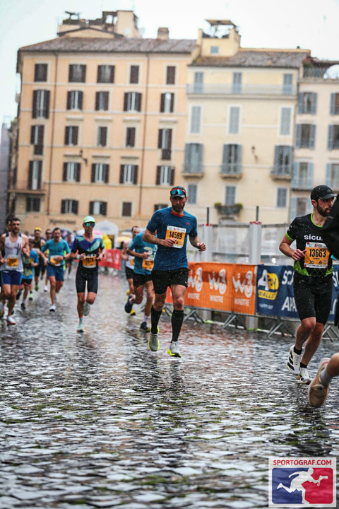 Alla mezza maratona ero in controllo, proseguivo oscillando tra i 4:10/km e i 4:17/km (il percorso variava spesso e si sono alternate pioggia e forte vento contro) fino al km 31, quando l’alternanza dell’asfalto tipico di Roma mi presenta un fastidio sotto la pianta del piede che non mi abbandonerà più, per cui decido di tenere un passo solo leggermente più conservativo tra i 4:19/km e i 4:23/km.