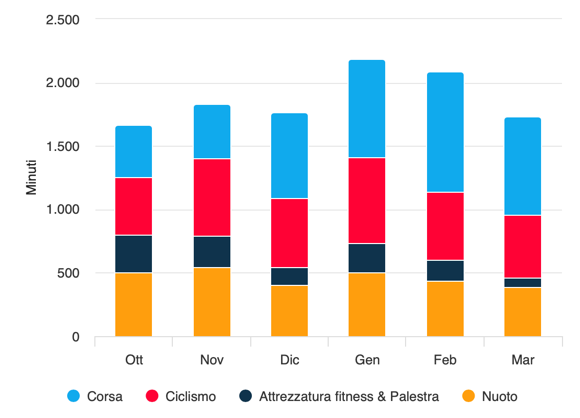 Qui nel grafico è visibile la distribuzione del volume totale di allenamento (espressa in minuti) che ho svolto considerando tutte le discipline, inclusa la palestra (solitamente non presa in considerazione nel volume di lavoro di endurance).